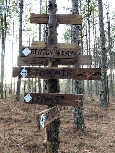 A few more minor ups and downs and by late evening we arrive at our destination, the little branch (with the large trail directional sign) just before Cave Spring Road. Well look, sign says Key West that-a-way. We pitch in the soft bed of pine needles and are down before dark.