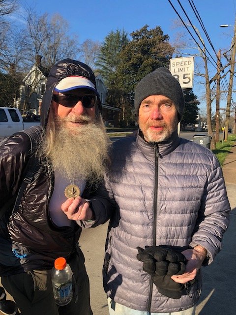 Logistics all squared away, at eight we begin the roadwalk. Just two blocks up we’re greeted by John Johnston, the local artisan who kindly provided the fine Pinhoti pendant yesterday. His eyes light right up when I unzip my jacket