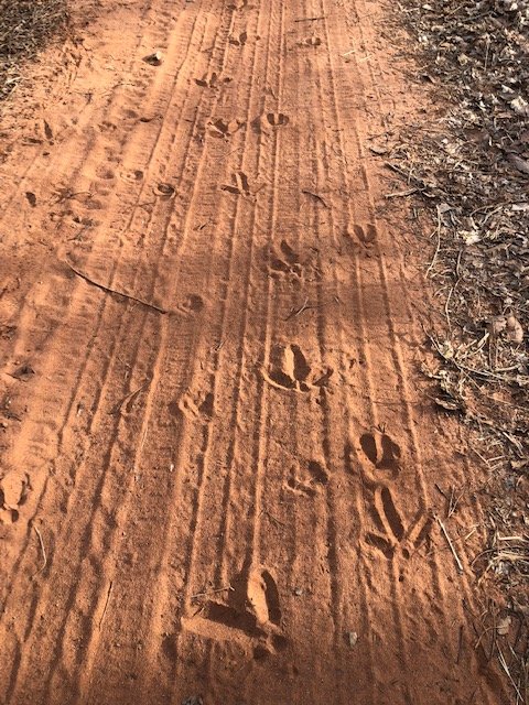 Copperhead, Little John, Ryan and I aren’t the only ones making tracks today. A segment of the trail passes along an old dirt road, and in the dirt are fresh turkey and deer tracks! So very appropriate, the turkey tracks. The word Pinhoti is Cherokee for Turkey Home. The symbol on the plastic Pinhoti Trail blaze is the turkey track!
