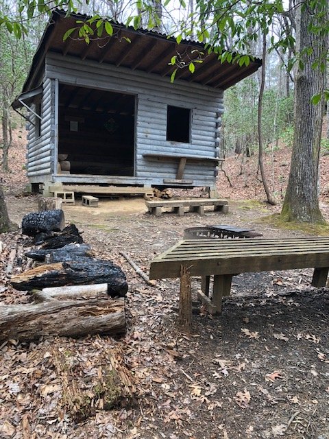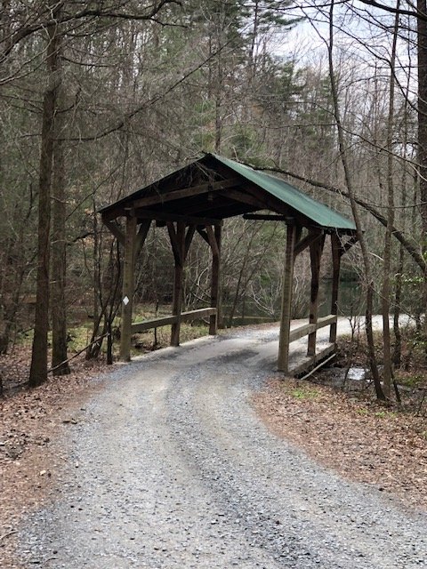 property. Years ago, when Joe Sisson began developing his mountain holdings he set aside land for a trail corridor for the Benton MacKaye Trail to pass. It’s a delightful segment of trail for over four miles–along the mountainside, along spring-fed streams–and near many weekend and vacation homes. Here, the trail also passes a covered bridge and a fine shelter. I stop to sign the register. My hike ends today as I exit the Sisson property to cross the four lanes of nonstop traffic on US-76.