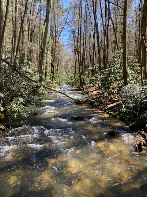 The hike today is typical southern Appalachians, ridge to gap to ridge, then to be repeated over and over again. This morning it’s up from the river to Tom Dicks Mountain. Then to Bryson Gap, then from No Name Mountain to No Name Gap, with the final climb and descent to Three Forks.