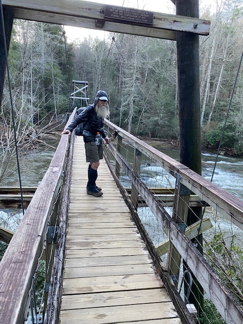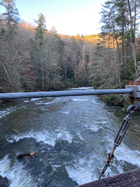 The Toccoa River suspension bridge is all I remember it to be, an amazing architectural work. It’s aged a bit, 20 years since I crossed it last, so it’s older too. With the roaring Toccoa this morning, it’s really impressive. Barry hikes to the bridge with me, to get the obligatory photo ops.