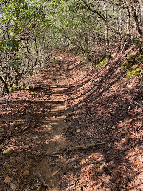 The morning starts out cold, mid thirties. So, hands in my pockets to begin with–through numerous green tunnels (rhododendron and laurel hells).