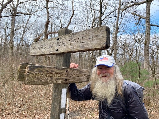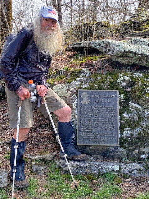 The Benton MacKaye Trail comes in and ends/begins on the AT a short distance from the summit of Springer. By turning and hiking it a couple-hundred yards, it’s possible to pay regards to Mr. MacKaye–by visiting the bronze memorial that’s been affixed to a large boulder there. I take great pride in showing this to Barry and Goldilocks, as I was involved in getting the memorial placed here. That was back in 1997, 24 years ago.