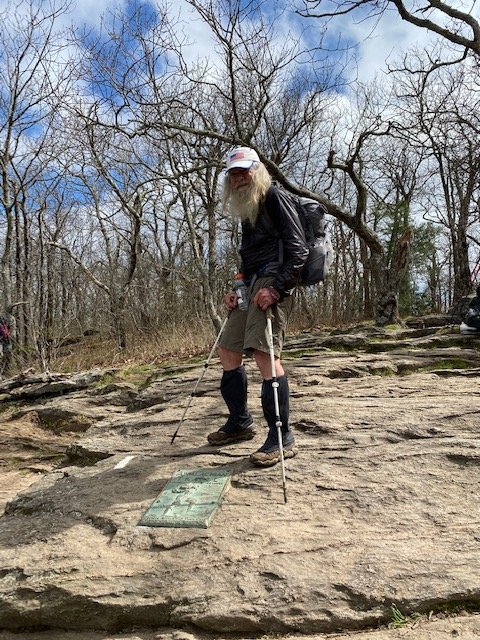 On the summit, we linger by the bronze AT plaque. Nearby is the first AT white blaze. A number of soon-to-be AT thru-hikers are here, filled with great energy and much excitement. Ahh, this is indeed another very special place. Over the years, many a life began changing for the better–right here!
