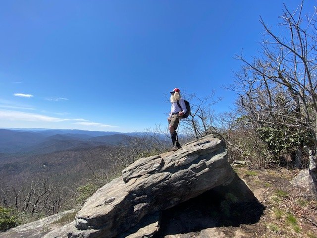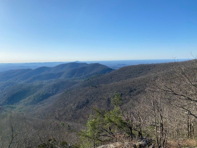 Early morning excitement as plans today are for Lucky to hike Blood Mountain with me. Hikers at the hostel shuttled back to the trail, we load and are on our way to Woody Gap. It’s a not so cold cloud-free morning as we head up and around Steel Trap and Jacobs Knobs–on our way to Big Cedar Mountain and Granny Top. We’re afforded great views along, especially from Preacher’s Rock (yesterday’s overlook was from Ramrod not Preacher’s Rock).