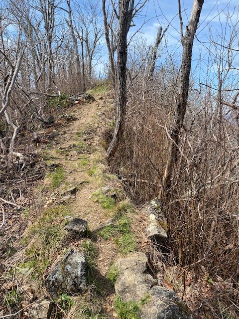 Coming off Wesser Bald the trail drops down a narrow razorback ridge cluttered with rocks and roots. I must concentrate on every foot placement, lest I lose my balance, trip and fall. I can see where the trail goes hundreds of feet below. Very scary.