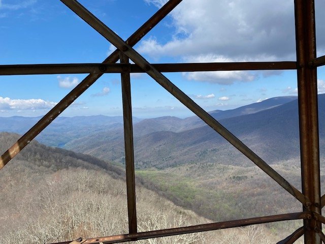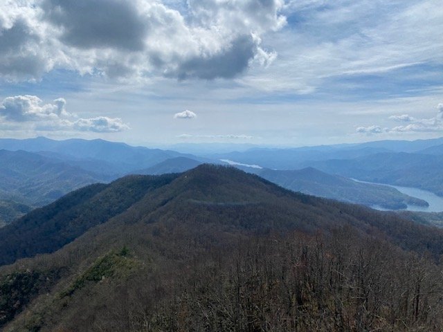 deposit them in the permit box–and immediately begin the 2,300-foot climb to the Shuckstack Mountain Tower. The continuous climb takes us just shy of three hours. And what an absolutely amazing reward for the effort; it’s