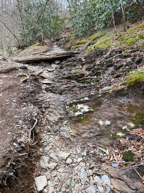 Rugged mountains mean rugged trail. Plenty of up and down rocks and roots. Without hiking sticks to brace and lift me, it’d be hand-over-hand ups and butt-skid downs in places. The Vibram Army (plus horse traffic) have left an indelible mark on what used to be (35 years ago) pleasant, friendly trail. The trail is nearly impassable, some sections. As a result, horse traffic is no longer permitted. Ma Nature has placed roots in certain places to aid hikers during their up-scrambles. Unmercifully slow, dangerous going in many places along today; one slip and this odyssey is all over.