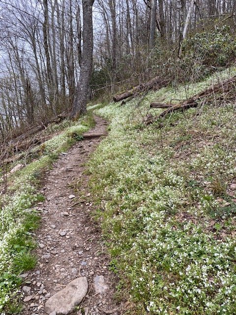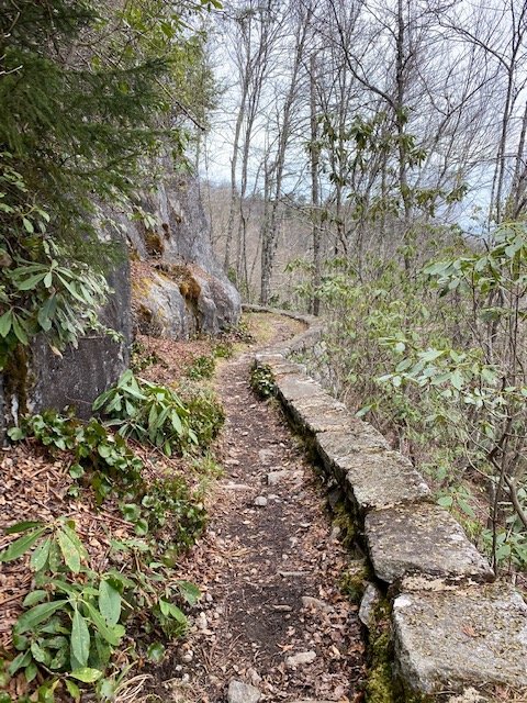 Now the scary part, steady and steep descent to Pigeon River at Davenport Gap past historic rockwork by the Civilian Conservation Corps (cribbing and walls). Another stumble and bumble the rocks and roots day, through continuous cold overcast.