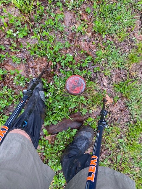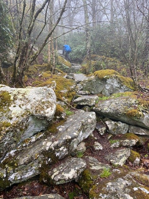 The rain has turned the hiking experience today to mud boggin. Slow going up here in the clouds. I must hasten best I can to get the miles in. I do pause for a shot–one of the many survey markers, the line between North Carolina and Tennessee (left foot in Tennessee, right foot in North Carolina). Late afternoon I finally take a break at Flint Mountain Shelter. I’ve hiked some with Mike today and we have lunch together. Barry soon comes to greet me, and to hike back out with me.
