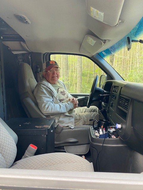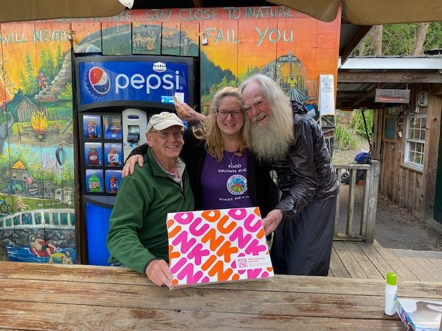 aren, have driven almost two hours from their home in Marion to greet me (and to bring me a box of donuts). Ed was also here to greet me when I arrived Erwin during my southbound ECT trek in 2000. He spent time with me, hiked some with me that year. That was October 29th and 30th, 21 years ago, my 62nd birthday. Not to Worry was sitting then, waiting patiently at one of the many little foot bridges just north of the river. He greeted me (as did he and Karen greet me again today) with a box of donuts! What a wonderful moment, then and now. This day has turned around quite nicely!