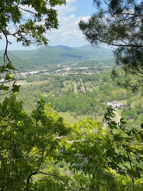 A couple fine vantages of Erwin on the descent to the Nolichucky River and Uncle Johnny’s Hostel. The mountain laurel are budding now, many in full