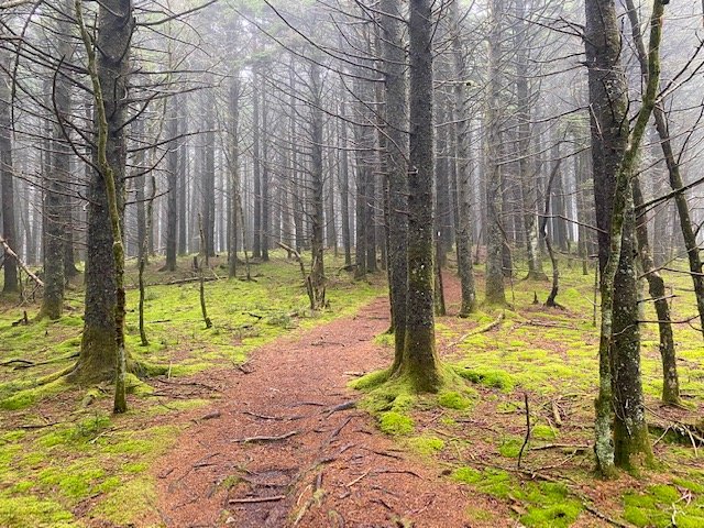Donuts provided by Ed and Karen, V-8 by Barry, we’re both energized for today. Charlotte is back to get us right at eight sharp, then to shuttle us back to Indian Grave Gap. Birdee and I are packs up and headed on north toward Beauty Spot and Unaka Mountain by 8:30. Forecast has been for off-and-on rain–it’s on. Our rock and root climb up and over Beauty Spot and Unaka, we’re totally engulfed in the shroud, no views from the sky-loft vantage that is Beauty Spot. But please, folks, I’m not complaining, not in the least–because this journey, this “Odyssey 2021” has been (and is) totally charmed. During the 80 days I’ve been out here, this entire time I’ve suffered (if you want to call it that) count-on-one-hand the total number of bad weather days! So, no grand gawking from Beauty Spot (I was blessed with clear skies on previous journeys through). But Unaka Mountain? The rain, the mist-laden fog-clouds just added to the mystic spell of the majestic
