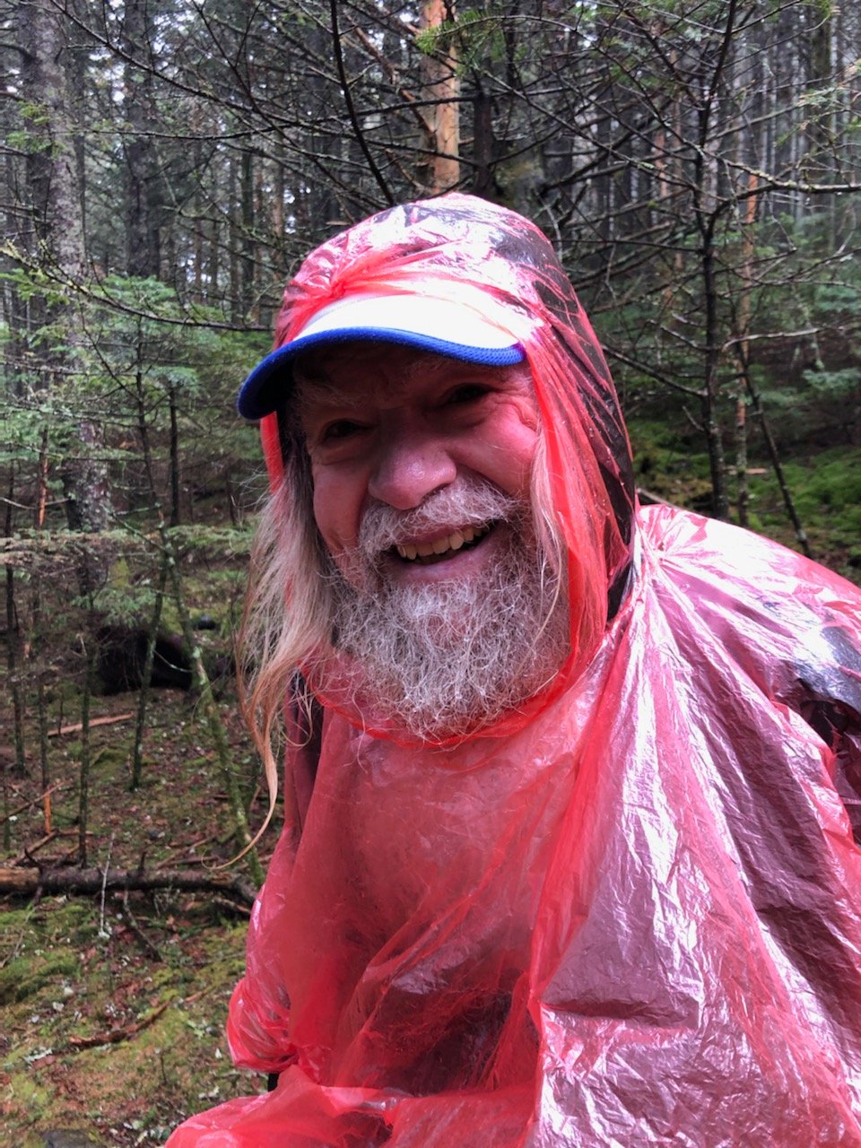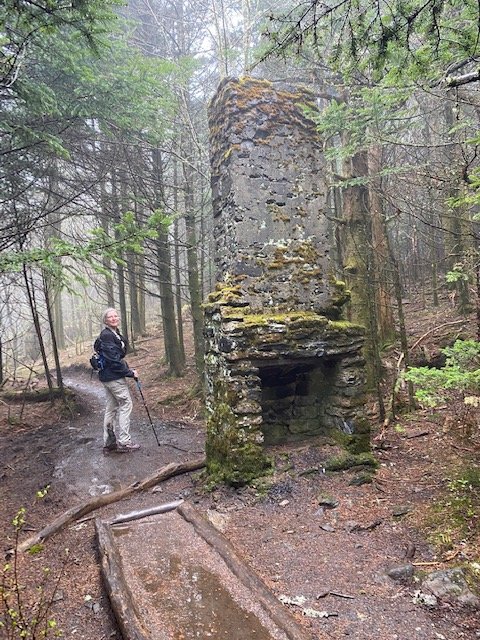 We’ve a difficult, steady climb up to the old Cloudlands Hotel site at 6,000 feet. The rain continues the entire time, and it’s turned bitter cold. Cloudlands? Appropriately named. We’re totally engulfed in the cloud shroud. The old ruins are gone now, nothing to see. The Catawba Rhododendron (the beautiful red flowering plant for which Roan is famous) are nowhere near their blooming stage. The mountain is forbiddingly dark and cold. We pause briefly for a photo of the sign that describes the place (half ripped out of the ground), and we move on.