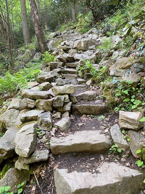 Trail, Laurel Fork Gorge/Laurel Fork Falls. And seeing the falls again? It has more (and special) meaning to me this time. I wasn’t aware that the little branch (Upper Laurel Fork) that I hiked beside to get to Scotty’s hostel the other evening, and which begins in the mountain meadows just above his place, is the origin of the incredible cascade that comes crashing down from the brink of Laurel Fork Falls. This morning, as on previous occasions, after carefully descending the incredible stone, (say boulder) stairway, I stand gazing up at the falls in total bewilderment. To add depth and meaning to my feelings about this place, I’ll post here a quote from my book, Ten Million Steps:
