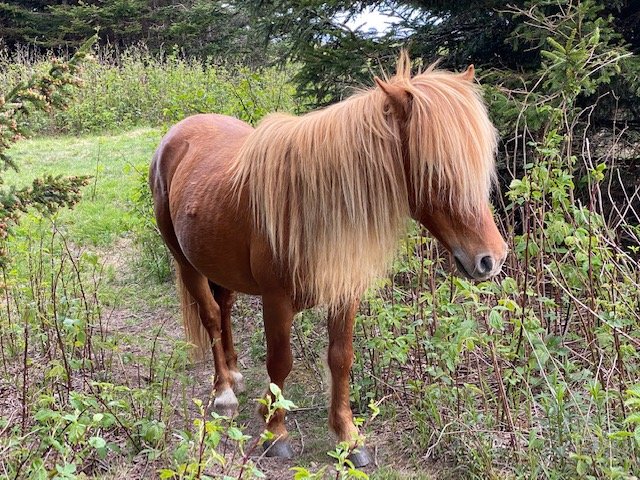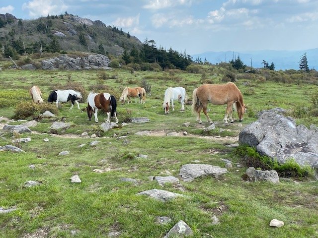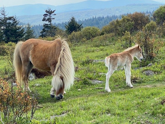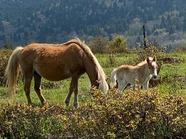 Mid afternoon we reach the highlands, Grayson Highlands, which stand well above 5,000 feet. They’re quite correctly (and famously) described as “A bit of Montana dropped on the rooftop of Virginia.” And indeed, the day has turned magic, as the wild ponies (one with foal) are foraging directly on the trail, and I’m able to slowly walk directly to them without disturbing them in the least.