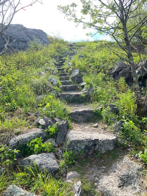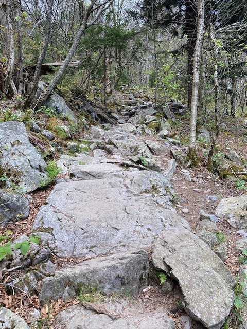 We’ve a long steady climb first thing, up, and more up, over 2,000 feet of up to reach Buzzard Mountain. The trail is an incredible jumble of rocks and roots making it impossible for me to remain steady on my feet. However, my balance and reflexes have definitely improved during the past two months, and that’s such a blessing!