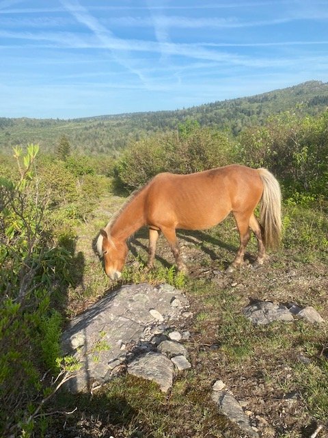 The AT continues meandering the lush open meadows of Grayson Highlands, beside the picturesque boulder-topped pinnacles, for which the Highlands are famous. Famous, too, the wild ponies that live and thrive here. We’re soon the happy visitors among more of them; plus another little foal. Lots more pictures. I’ll share a couple.
