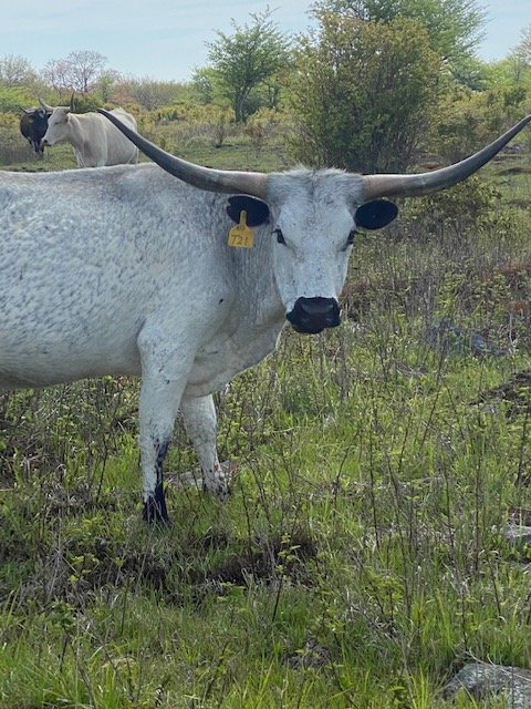 As we continue, the meadows slope down. Passing a gated fence, more animals of interest–longhorns; lots of longhorns.