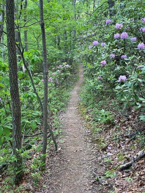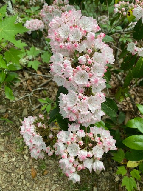 The beautiful Carolina rhododendron, they’ve all bloomed out now and are beginning to drop their petals, while the mountain laurel is transitioning from budding to blooming–and today, I get really good photos of both happenings.