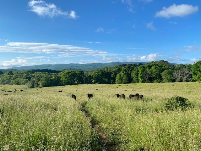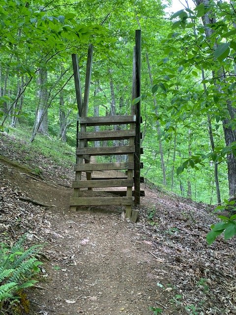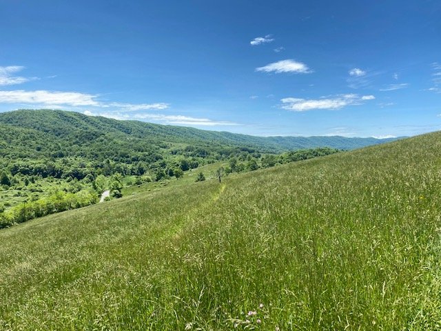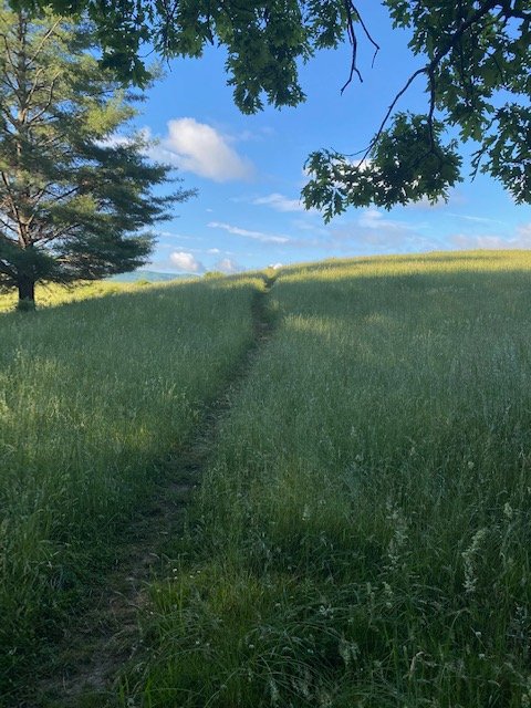 Across (under) I-81 the trail out is just as pleasant as it was coming in yesterday–lush high mountain meadows and pastures, the trail meandering, passing through gates and over fence styles. And this day is another blue-perfect one!
