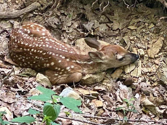 Another surprise today, one often hoped for but seldom if ever seen–a little fawn laying quietly right beside the trail. Got the picture to prove it!