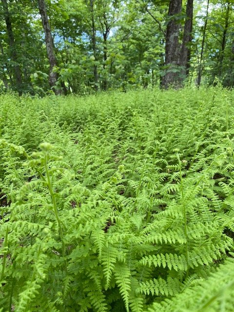 I’ve a steady climb, switchbacks first then a straight-up the rest of the way (1,400 feet) to the ridge. More cobbed-up rocks and boulders to deal with on the ridge. However, there are large lush patches of fern and great views. So, stumbling and hammering the boulder fields–well worth the effort!