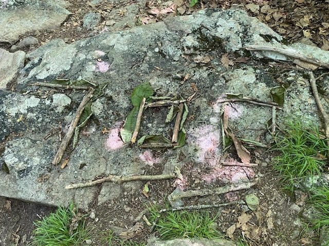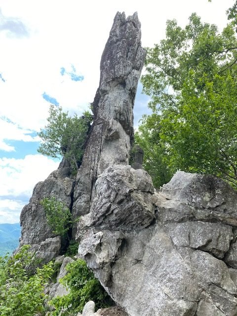 Breakfast chores done, Carebear loads us and we’re soon back to VA-621 to resume our hikes north. A group selfie with Carebear and we’re off to Dragon’s Tooth (a giant projectile-pointed boulder rising from the southern end of Brushy Mountain.