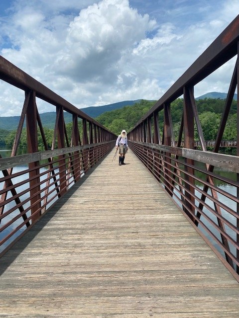 By one, the long descent is done and I’m standing at the James River pedestrian (AT hiker) bridge. Gretel, who hiked down ahead gets a shot of me by the bridge, then on the bridge.