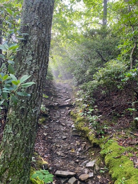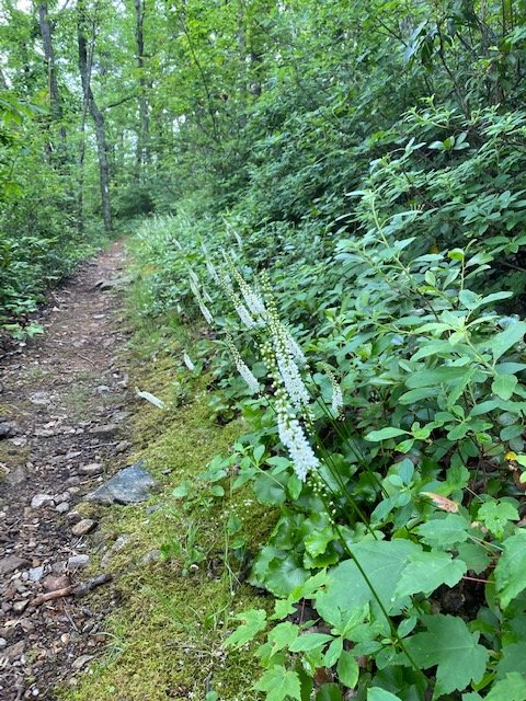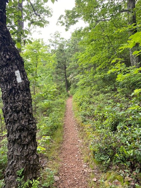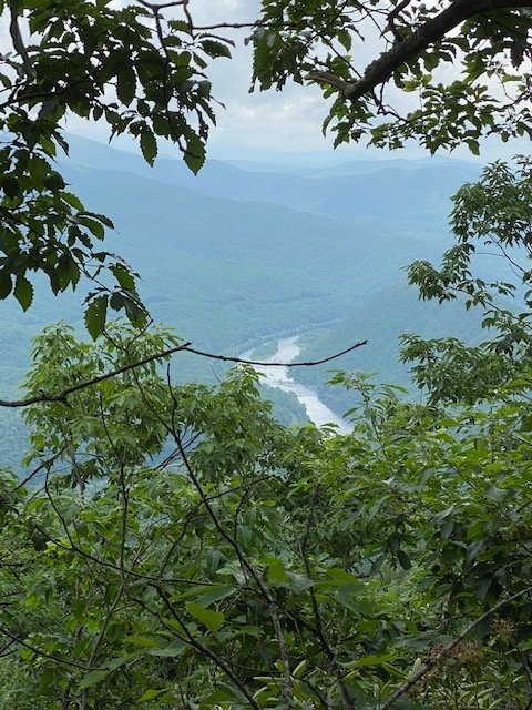 It’s a long winding road up to Petites Gap, but Kimm has me up there, out and hiking through the James River Face Wilderness shortly after eight, on the winding trail up to Highcock Knob. Its slow going through mud and rocks. Late morning I’m up and over, headed down, and more down, to a stunning view of the James River.