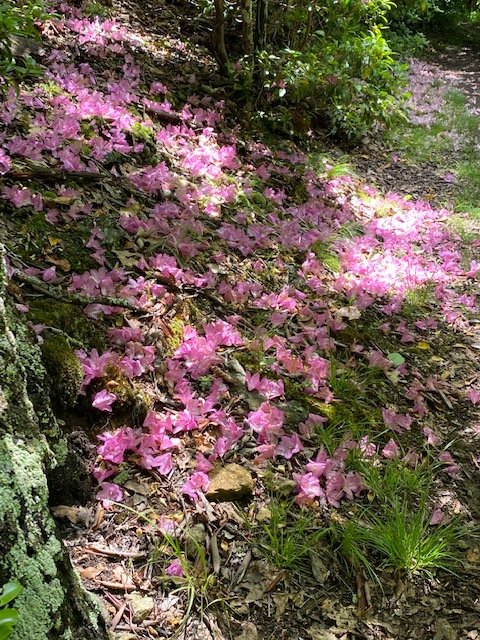 From the Ledges it’s a very rocky 3,000 foot bail-off to VA-56 where Safari is waiting to pick me up–as T-Bone must return to work. Ahh, but it’s not goodbye time yet as he and Tulip will be coming to the Shenandoahs to support me next weekend–and hike with me some there!