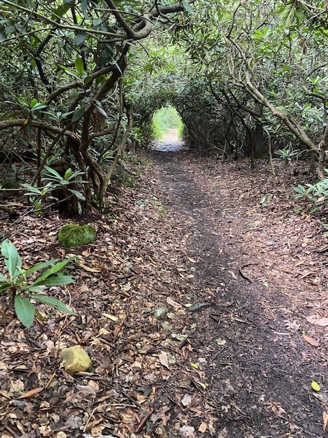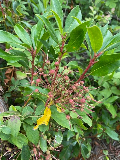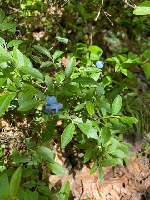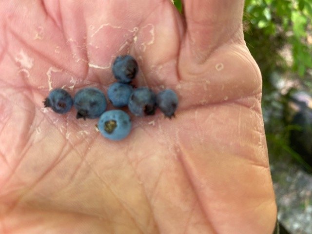 The wild lowbush blueberry is beginning to come in, bearing delightfully sweet berries. In another week or so there’ll be handfuls to pick all along the trail.