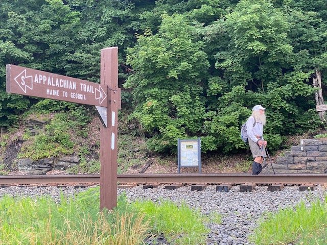 The trail heads out of Duncannon on one of the residential side streets, but we trek out on the main drag–in a gentle shower. Couple blocks down, a car pulls to the side. Lady comes toward me, greets me. “I’m Trail Angel Mary” she says. Big smile on her face. “I shuttle hikers anywhere they want; got two loaded in there now–can I get your picture?” she asks. I stop. The rain has slacked. Trail Angel Mary and me, we get our picture taken.