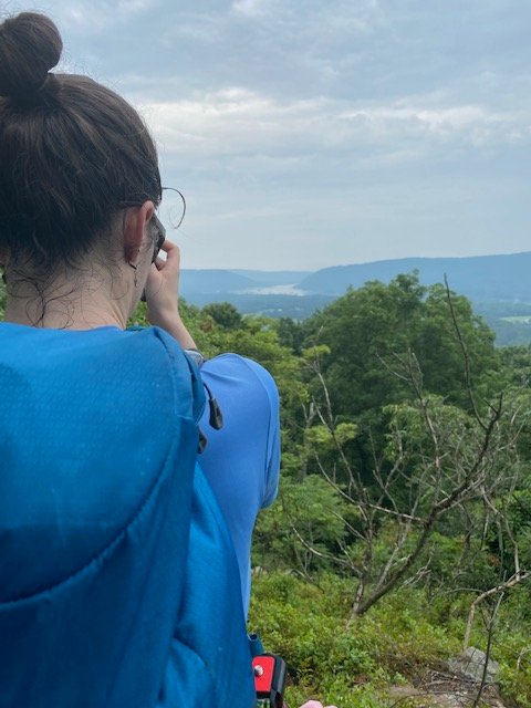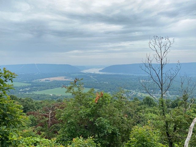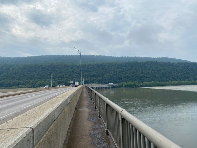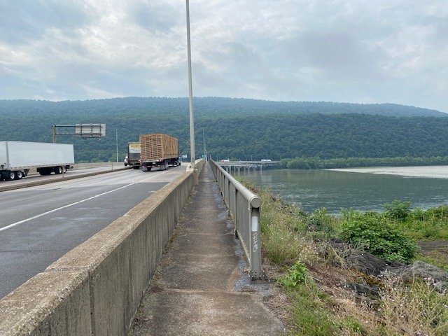Busy, heavy commercial traffic, US-22. There are two long bridges to cross, first the Juniata, then Clark’s Ferry across the Susquehanna. We must then cross three busy sets of railroad tracks before finally beginning our ascent of Peters Mountain, a thousand-foot climb up switchbacks, through rocks and boulders, to reach more rocks and boulders (big time) on the ridge. Well worth the climb, though, for the wide, impressive views down to the Susquehanna River and the village of Duncannon.