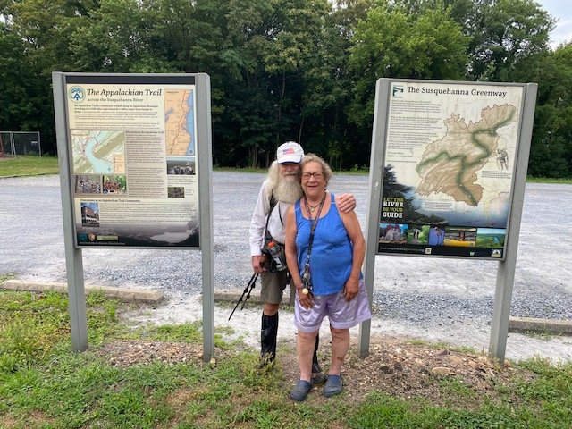 The trail heads out of Duncannon on one of the residential side streets, but we trek out on the main drag–in a gentle shower. Couple blocks down, a car pulls to the side. Lady comes toward me, greets me. “I’m Trail Angel Mary” she says. Big smile on her face. “I shuttle hikers anywhere they want; got two loaded in there now–can I get your picture?” she asks. I stop. The rain has slacked. Trail Angel Mary and me, we get our picture taken.