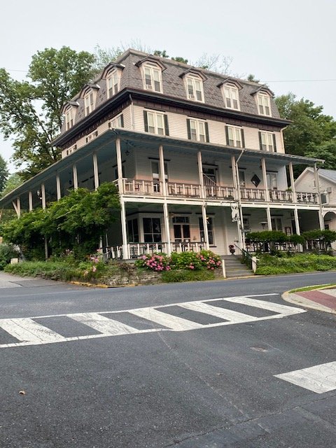 I’ve a very soft spot in my heart for old places, like the Deer Head Inn here in Delaware Water Gap, built in the 1840s. Home of jazz in the Poconos, the Inn is the oldest continuously running jazz club in America. My room, the Queen Room, though nearing 200 years old, had all modern conveniences, just no elevator, and I was on the third floor (like that mattered). Creaky wood floors, high ceilings, transom windows above doors, all the neat old architectural features–my kind of place!