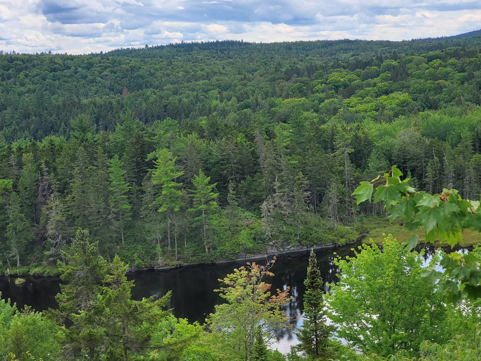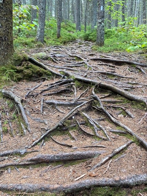 Turns out a long, difficult go of it–up-mountain, down-mountain, a fair amount of hand-over-hand up, shinny & skid down. Plenty of rocks, off-camber boulders, plus corrugated root tread. Over eleven hours on trail to cover the 15 miles. But the ruggedness also brings unequaled beauty. A visual jolt, the forest here compared to further south. Birch, fir, spruce, waterfalls, the delightful high-mountain ponds, beaver. And the loon, I hear the unmistakable beckoning call of the loon, a sure sign I’m in the north woods.