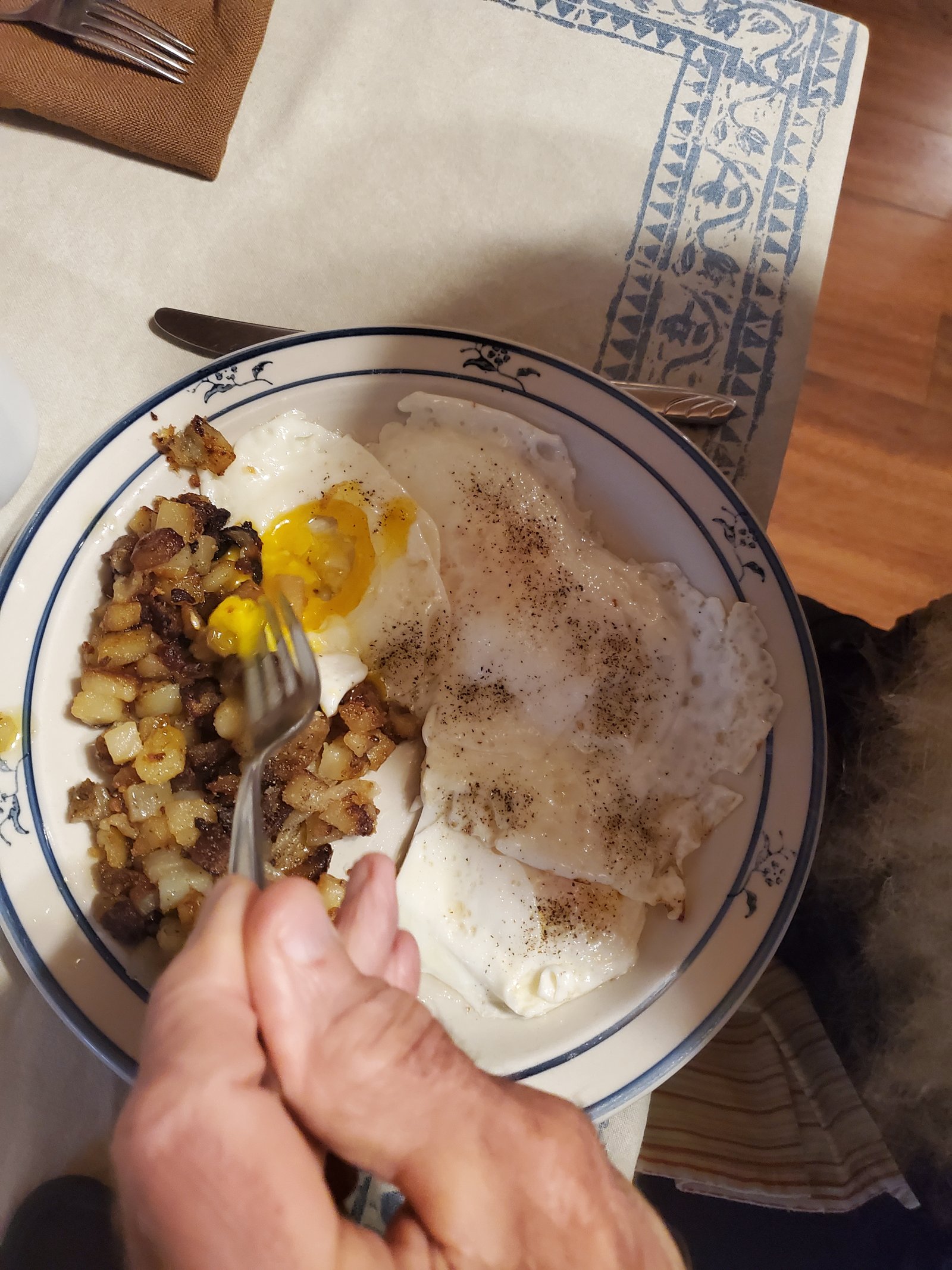 A hungry hiker breakfast prepared by Poet–bacon and eggs (3), country fries, blueberry pancakes, and plenty of orange juice & coffee. Late morning, during a break in the rain, we head for the corner General Store for lunch.
