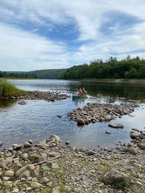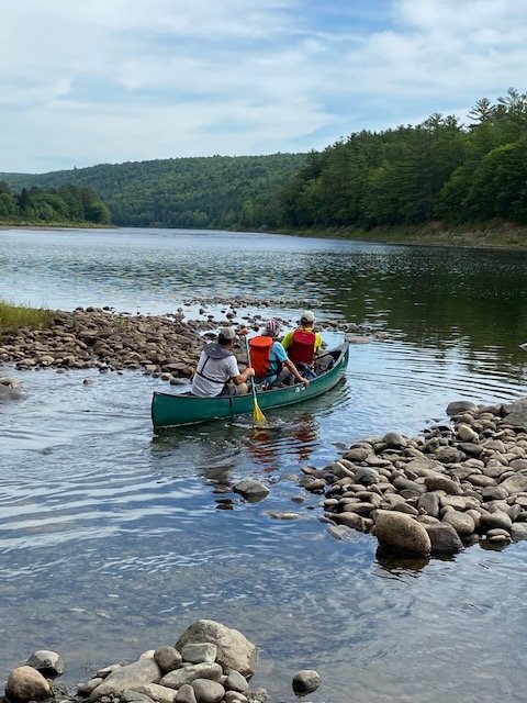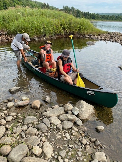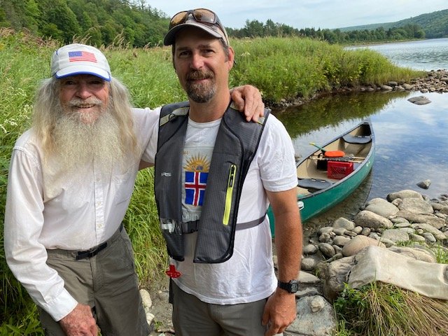 This morning, Zack shuttles me the short distance up to where the trail crosses ME-201, and I’m headed toward the Kennebec River a little before nine. The Kennebec is a formidable river, wide and deep, a dangerous ford. AT hikers need to cross it. So, years ago, back in the eighties I believe, the Appalachian Trail Conference set up and funded a canoe ferry service on the Kennebec for hikers. Steve Ferryman Longely piloted the canoe for years. After my first crossing in 1998, then seeing him again in 2000, we became friends. Greg Caruso now runs the ferry service, has for the past six years. When I mention to Greg that Steve was a friend, he tells me about the memorial for Ferryman, placed in a remote spot nearby. “Few people know about it. Would you like to see it?” Greg asks. So, after the nine o’clock rush is over, Greg takes me off-trail and over to the boulder so I can see the memorial. Thanks for your thoughtful kindness, Greg, much appreciated!