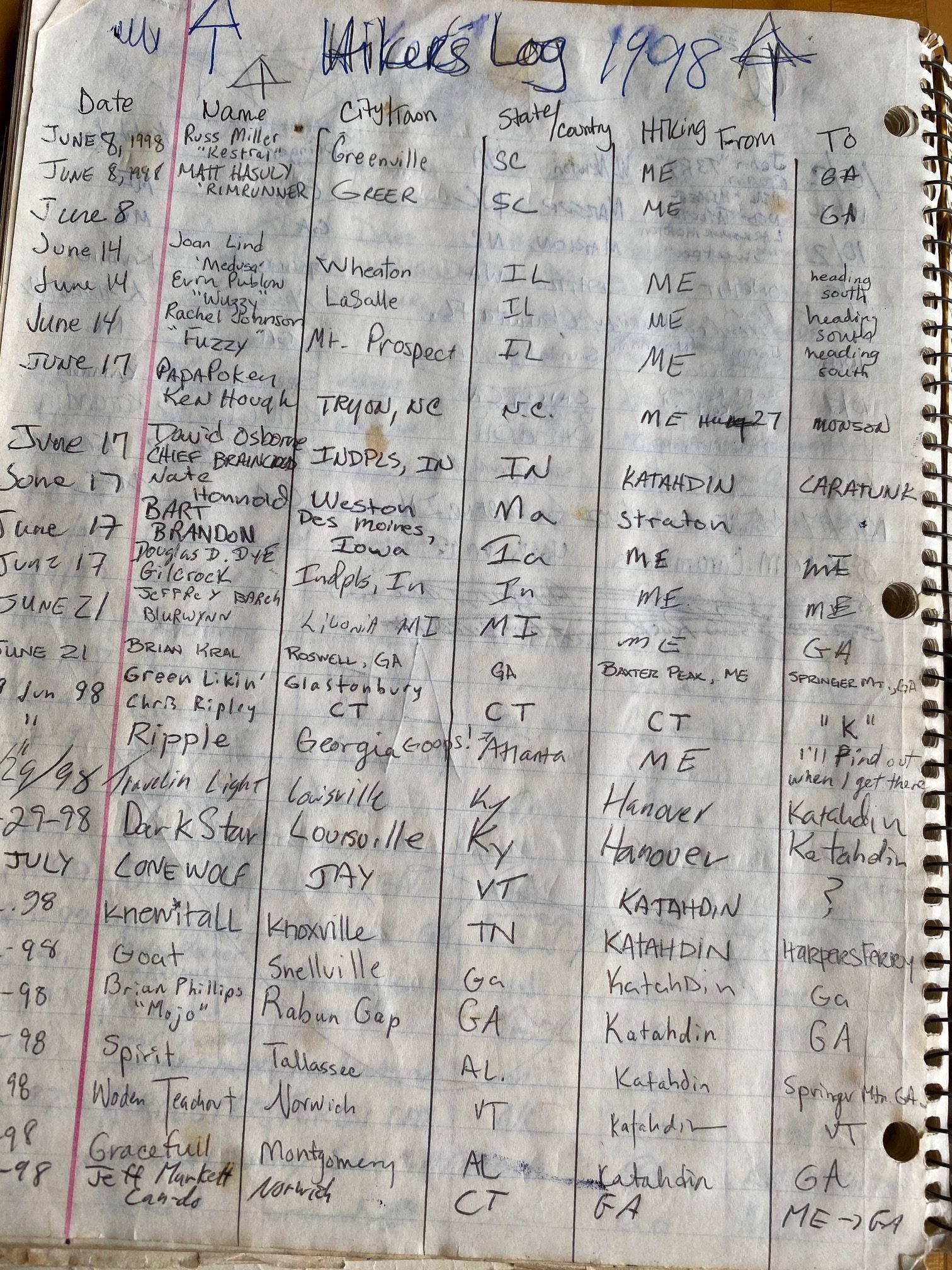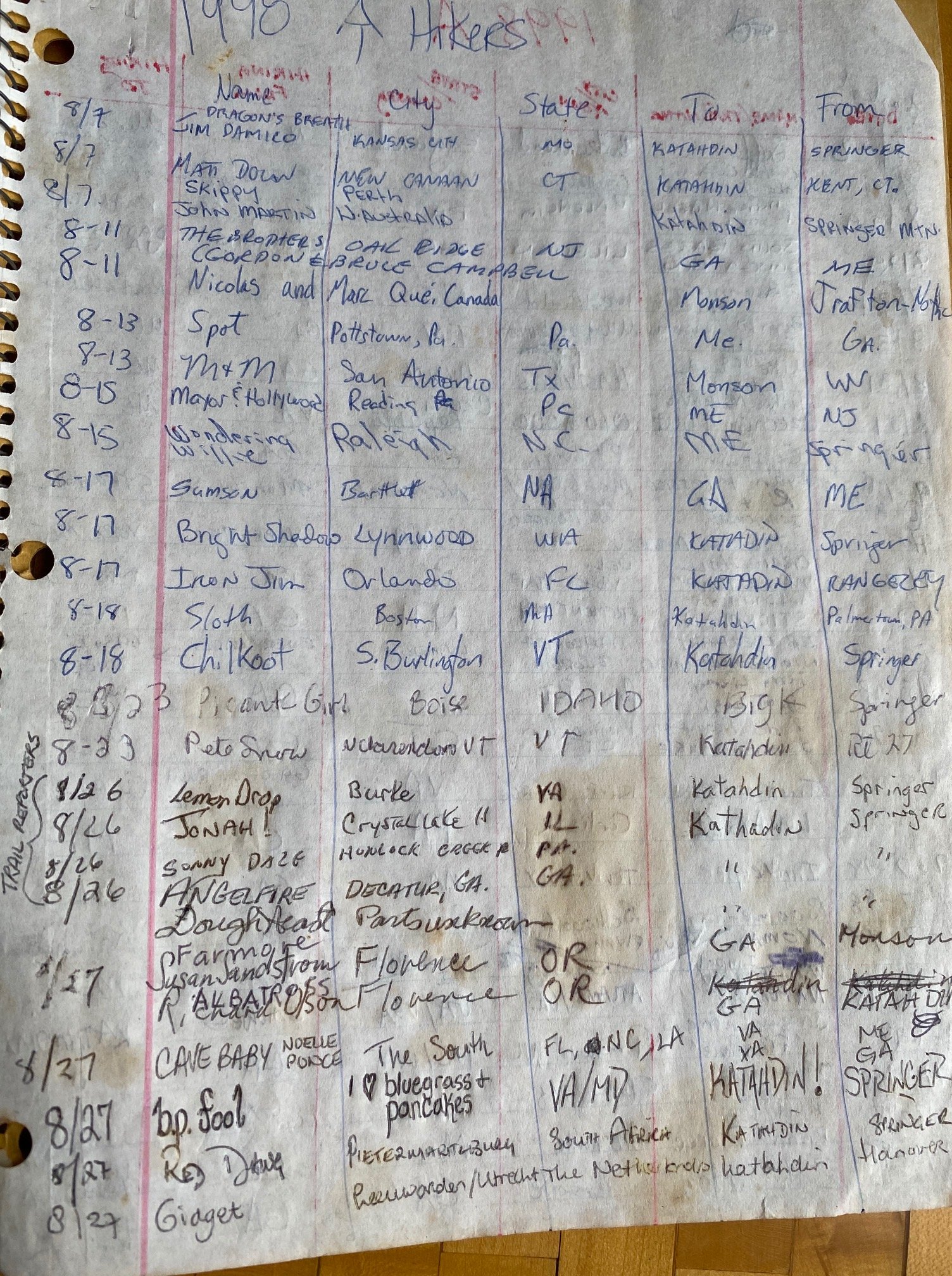 After the river crossing I’ve a hard, steady climb up to Pierce Pond, and Harrison’s Pierce Pond Camps. There’s a side trail over to the cabins. I don’t usually do side trails. However, I don’t want to miss this one. My hopes are that Tim Harrison is still here and I’ll get to see him again. And luck is with me! During the time spent with Tim, he brings out his old faded and soiled AT hiker register for 1998. So many familiar names from the past. Faded memories; old friends. And what a great friend you’ve been to hikers these many years–thanks Tim!