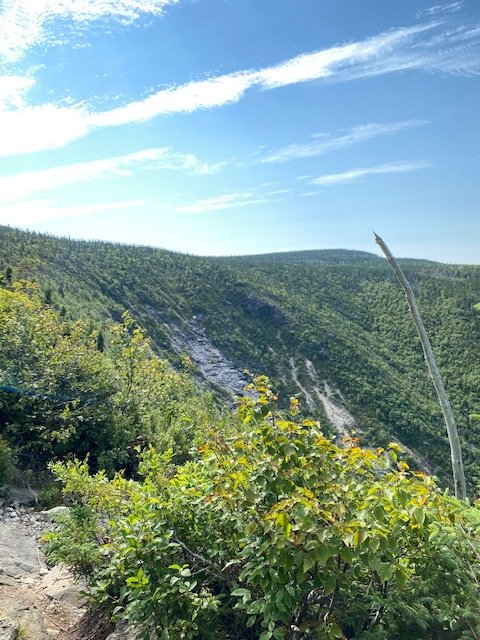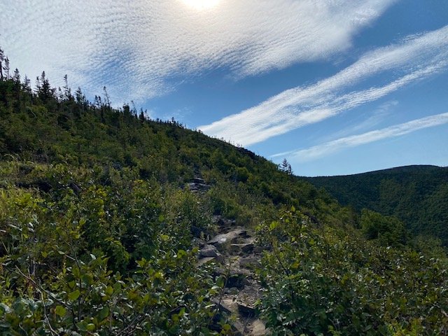 I’ve a 1,400-foot climb first thing, to Sugarloaf Mountain. Up, up, hand over hand through boulders, the cliff face. But after all the effort, the AT passes below the summit 1/2-mile away by a side trail. I continue on, along the ridge where there are great views of Mt. Abraham.