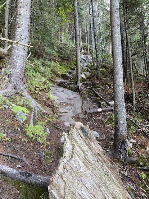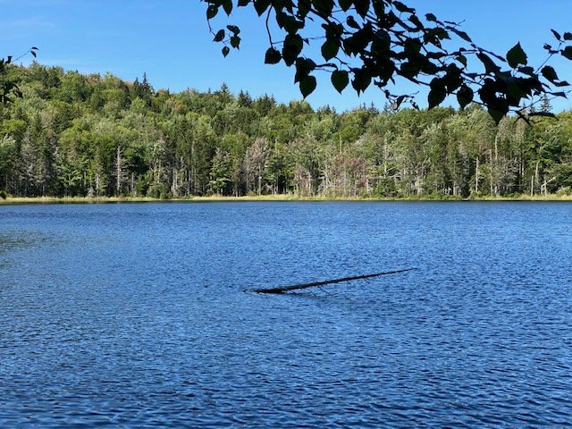 We’ve two long and difficult climbs right away. First, up and over Moody Mountain, ditto for Hall Mountain. More ledge climbing; more mud. But we concern ourselves the least with these expected trail condition. Rather, the day has turned blue-perfect, cool temps, light breeze, warm sun. Rusty and I hike along together enjoying this magnificent day. I see photo ops. Rusty sees a moose!