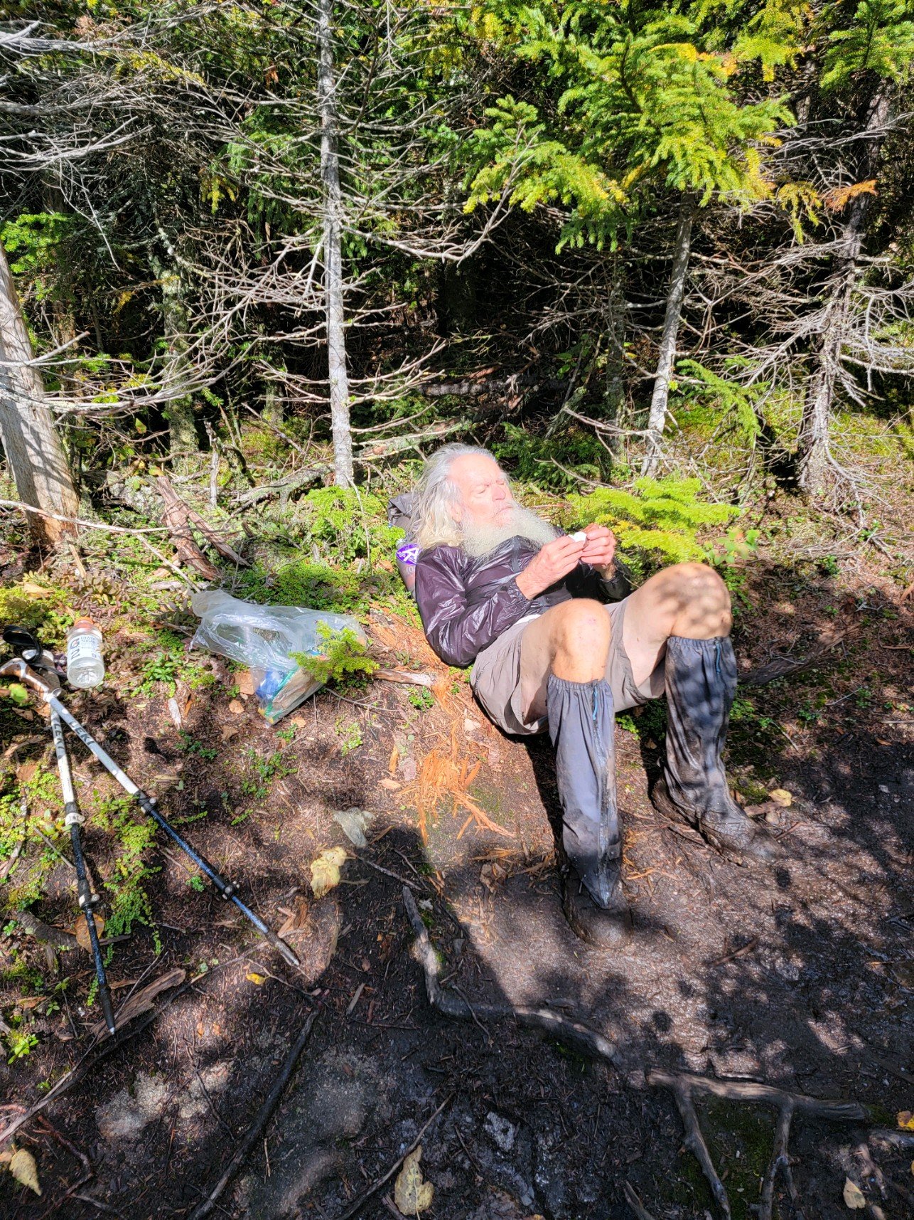 There’s room on the upper platform for one more. I move in. Odie prepares a hot nourishing Mountain House meal for me (that he’s carried up the mountain). Supper done–my lights are out-zzzzz.