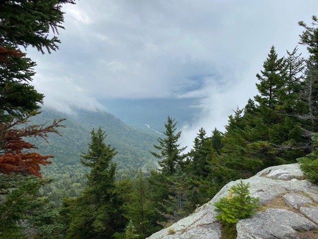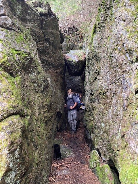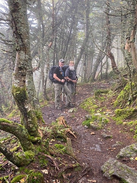 There’s enough light by six-thirty to see the trail, so we’re off to a cloudy, blustery morning. The climb today is up, up, and more up, well over a thousand feet to get us over Wildcat Mountain. There are a number of viewsites along, but we’re above (and in) the clouds.