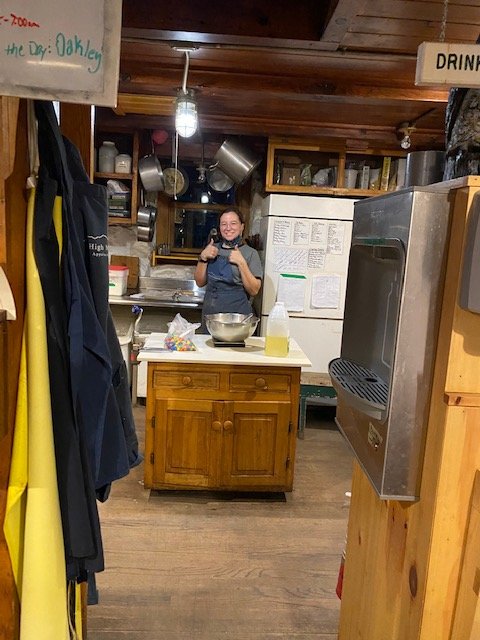 Theresa, hut crew member, has offered to get up early and prepare breakfast for Cat Tracks & me, and our table is set at six sharp with bacon, eggs, and steaming hot coffee.