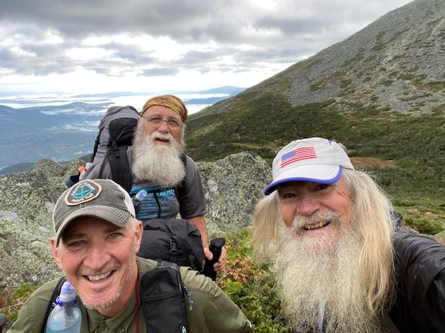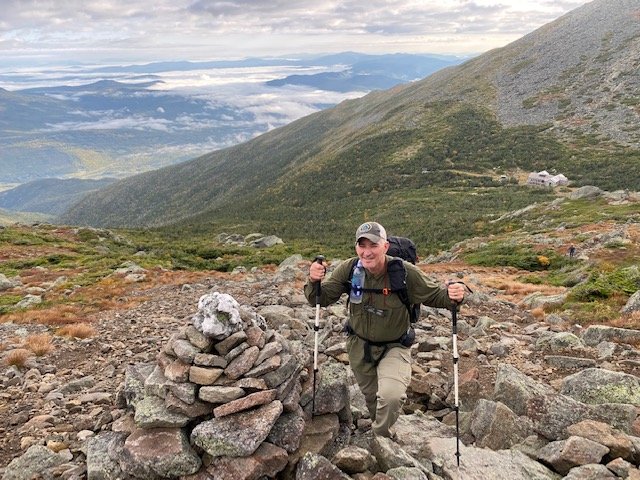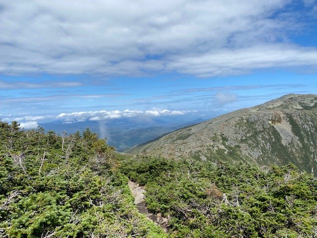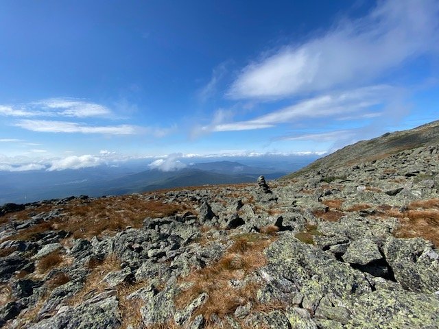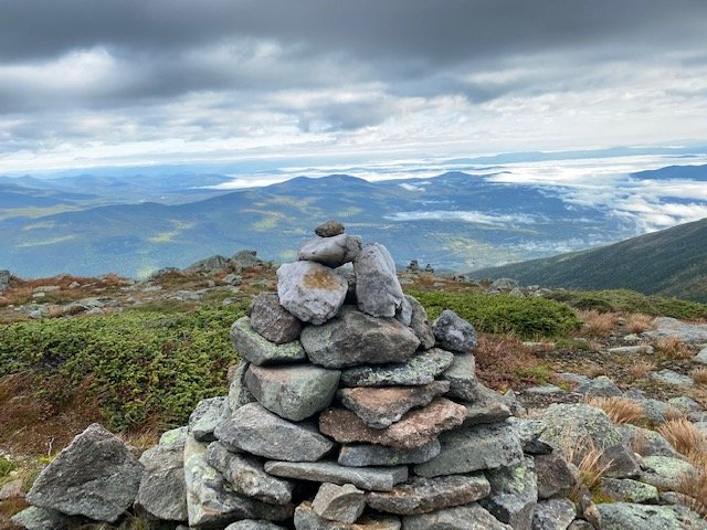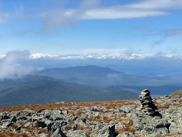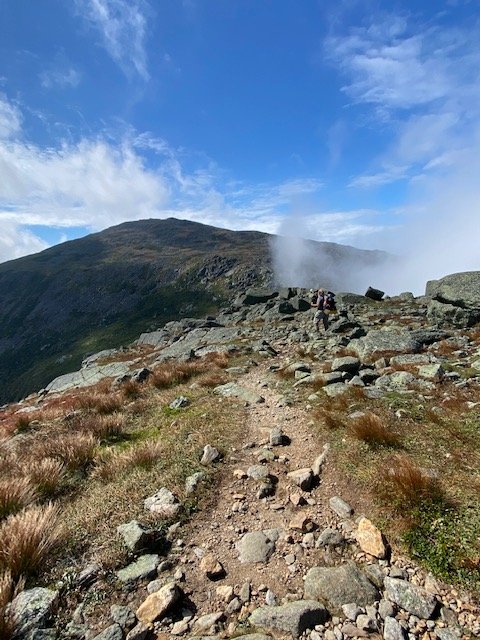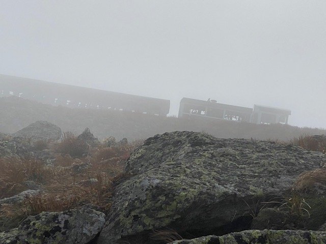 Out of Madison Spring Hut we’re headed into another weather-perfect day in the White Mountains/Presidentials Range. Plenty more of challenging, rock- and boulder-strewn trail as we climb past Mount Quincy Adams, then Mount Adams, Mount Sam Adams, Adams Five, Mount Jefferson, Mount Clay. Then comes the steep and steady ascent up Mount Washington. On that final climb for today comes the cold wind, bringing the eerie shroud so common to Mount Washington. We’ve been able to see its peak (cloaked in clouds) the past two days, and we’re now in that shroud as we climb.