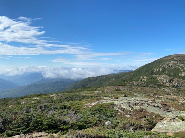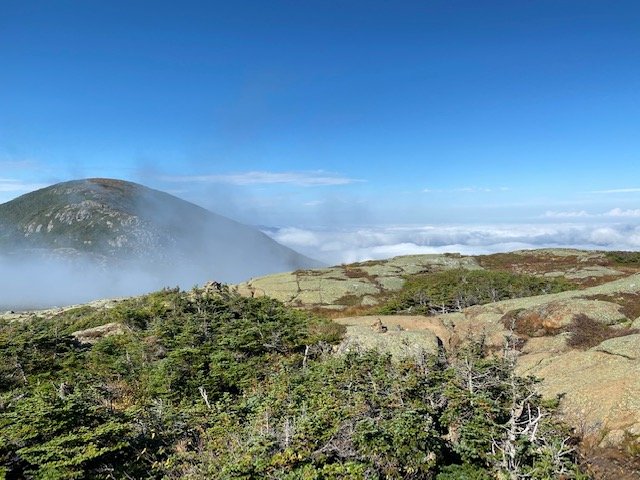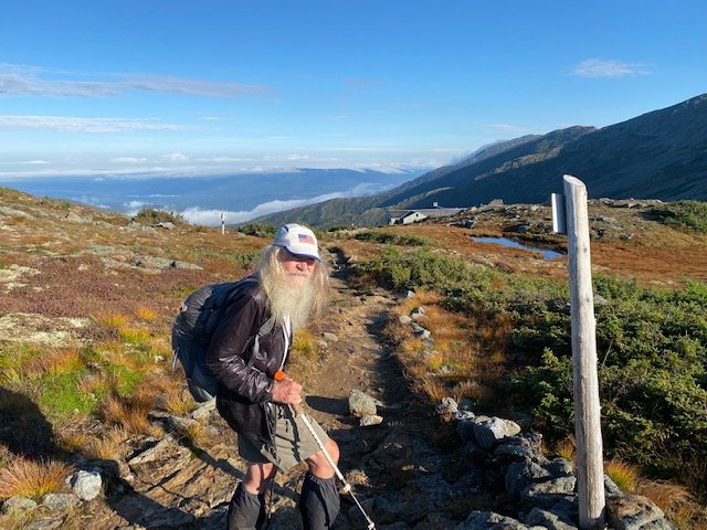 Jackets and other warm clothing off and on all day as the trail crosses back and forth over the high tundra ridge, trading sides with the Presidents. More fog-driven cold wind, then clear, opening amazing uninterrupted vistas in all directions. Clouds that aren’t being driven through occupy the lower elevations way below. It all makes for unbelievable photo ops. What an amazing time, a blessed time–for this old man to be alive, taking it all in.