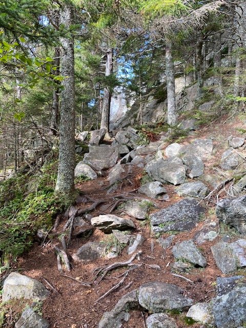 The hike today takes me up and over Mount Cube, a climb of 1,500 feet. From there, I’ve a descent of 2,000 feet before a final short climb of 500 feet to Cape Moonshine Road. Views today are limited but are spectacular–from Quartzite Ledges. There have been plenty more rocks, boulders, and roots, which makes for another eight-hour day (to hike eight strenuous miles), a long, difficult time of it…