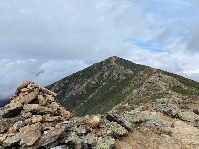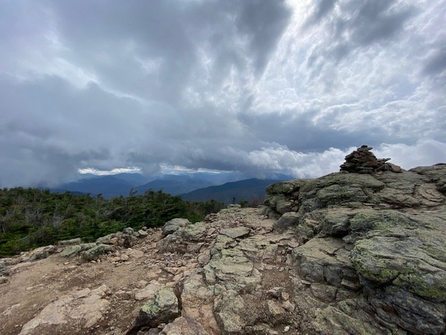 Hiking together now, through the relentless mud bogs and boulders, passing Liberty Mountain, we enter the alpine zone to finally gain the summit of Little Haystack Mountain–which stands just shy of 5,000 feet. Here, and for our grand effort, at this vista, we’re afforded unlimited sky-high views out and across the Presidentials and Whites. I capture some breathtaking shots of these near and far off ranges. Standing here now I’m awestruck by the jagged landscape presenting in every direction, to the far hazy blue–all above the clouds. I wish the pictures you see here did the least justice to this heavenly scene that’s on display before me. Part of the appreciated joy of it all comes from experiencing the exhausting effort spent in getting here.